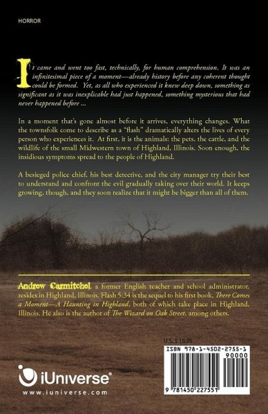 It came and went too fast, technically, for human comprehension. It was an infinitesimal piece of a moment-already history before any coherent thought could be formed. Yet, as all who experienced it knew deep down, something as significant as it was inexplicable had just happened, something mysterious that had never happened before ... In a moment that's gone almost before it arrives, everything changes. What the townsfolk come to describe as a "flash" dramatically alters the lives of every person who experiences it. At first, it is the animals: the pets, the cattle, and the wildlife of the small Midwestern town of Highland, Illinois. Soon enough, the insidious symptoms spread to the people of Highland. A besieged police chief, his best detective, and the city manager try their best to understand and confront the evil gradually taking over their world. It keeps growing, though, and they soon realize that it might be bigger than all of them. This is a book that will capture you - and then won't let you go - starting with the very first page. It is the most haunting story since "Night of the Living Dead."