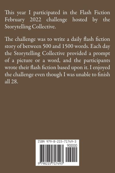 This year I participated in the Flash Fiction February 2022 challenge hosted by the Storytelling Collective (https://www.storytellingcollective.com/). The challenge was to write a daily flash fiction story of between 500 and 1500 words. Each day the Storytelling Collective provided a prompt of a picture or a word, and the participants wrote their flash fiction based upon it. I enjoyed the challenge even though I was unable to finish all 28.