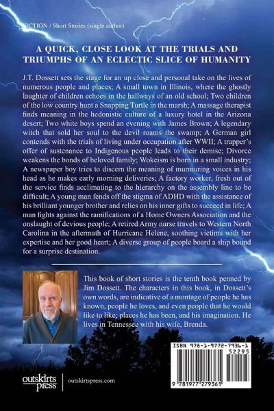 J.T. Dossett sets the stage for an up close and personal take on the lives of numerous people and places; A small town in Illinois, where the ghostly laughter of children echoes in the hallways of an old school; Two children of the low country hunt a Snapping Turtle in the marsh; A massage therapist finds meaning in the hedonistic culture of a luxury hotel in the Arizona desert; Two white boys spend an evening with James Brown; A legendary witch that sold her soul to the devil roams the swamp; A German girl contends with the trials of living under occupation after WWII; A trapper's offer of sustenance to Indigenous people leads to their demise; Divorce weakens the bonds of beloved family; Wokeism is born in a small industry; A newspaper boy tries to discern the meaning of murmuring voices in his head as he makes early morning deliveries; A factory worker, fresh out of the service finds acclimating to the hierarchy on the assembly line to be difficult; A young man fends off the stigma of ADHD with the assistance of his brilliant younger brother and relies on his inner gifts to succeed in life; A man fights against the ramifications of a Home Owners Association and the onslaught of devious people; A retired Army nurse travels to Western North Carolina in the aftermath of Hurricane Helene, soothing victims with her expertise and her good heart; A diverse group of people board a ship bound for a surprise destination.