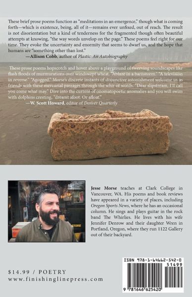 These brief prose poems function as "meditations in an emergence," though what is coming forth-which is existence, being, all of it-remains ever unfixed, out of reach. The result is not disorientation but a kind of tenderness for the fragmented though often beautiful attempts at knowing, "the way words unvelop on the page." These poems feel right for our time. They evoke the uncertainty and enormity that seems to dwarf us, and the hope that humans are "something other than lost." -Allison Cobb, author of Plastic: An Autobiography These prose poems hopscotch and hover above a playground of swerving soundscapes like flash floods of murmurations over windswept wheat. "Ablaze in a barnstorm." "A television in reverse." "Agogged." Morse's discrete instants of disjunctive astonishment welcome us as friends with these mercurial passages through the whir of words. "Dear slipstream, I'll call you come what may." Dive into the current of onomatopoetic anomalies and you will swim with dolphins cresting, "dreamt afoot. Or afloat." -W. Scott Howard, editor of Denver Quarterly