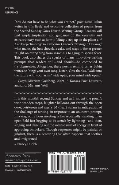 Book Description: Flash Poems offers an anthology of poems and the prompts that inspired them. These 100-plus thought-provoking prompts will help you manage writer's block and have fun in creative exploration. Whether you're an aspiring writer or a subject-matter expert, a blogger or a songwriter, a freelancer or a novelist, you're bound to find inspiriation in these pages. This collection of unedited poems inspired by prompts and written in ten to fifteen minutes represents many pleasant Sunday afternoons at the Second Sunday Goes Fourth writing group. Iris Craver, the founder of the group, was leading a poetry writing group for inmates at the Douglas County Jail. She thought it would be fun to also have a community writing group. We meet on the second and fourth Sundays from 2 to 4 p.m., thus the name Second Sunday Goes Fourth. There are usually 6 to 10 writers around the table. Our rules are simple. No self-deprecation is allowed. We don't critique others' writings. Appreciation and enthusiasm are encouraged. We keep a bowl full of writing prompts that we all contribute. When the pens are laid down we read around the table. Reading is always optional. One of our great pleasures is listening to what each of us has written and to see how our approaches are similar or different. There are always poems that are breathtaking in each round. We hope you enjoy these poems and try your hand at writing from the prompts. You can use the prompts or even pull a line from any of the poems to get you started in a flash! If any reader is interested in starting a community writing group, let us know by contacting the publisher! Have fun! Contributors include: Deborah Altus, Micki Carroll, Iris Craver, Kimberli Eddins, Louie Galloway, Katherine Greene, Sandy Hazlett, Joanne C. Hickey, Nancy Hubble, Dixie Lubin, Ronda Miller, Amy Nixon, Gail Curtis Sloan, Libeth Tempero. Second Sunday Goes Fourth