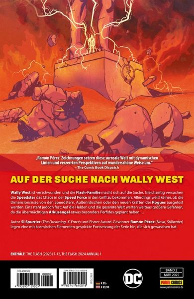 AUF DER SUCHE NACH WALLY WESTWally West ist verschwunden und die Flash-Familie macht sich auf die Suche. Gleichzeitig versuchen die Speedster, das Chaos in der Speed Force in den Griff zu bekommen. Allerdings weiß keiner, ob die Dimensionsrisse von den Speedstern, Außerirdischen oder den neuen Kräften der Rogues ausgelöst werden. Eins steht jedoch fest: auf die Speedster und die gesamte Welt warten weitaus größere Gefahren, da die übermächtigen Arkusengel etwas besonders Perfides geplant haben ...Autor Si Spurrier (The Dreaming, X-Force) und Eisner Award-Gewinner Ramón Pérez (Nova, Stillwater) legen eine mit kosmischen Elementen gespickte Fortsetzung der Serie hin, die sich gewaschen hat.ENTHÄLT: THE FLASH (2023) 7-13, THE FLASH 2024 ANNUAL 1