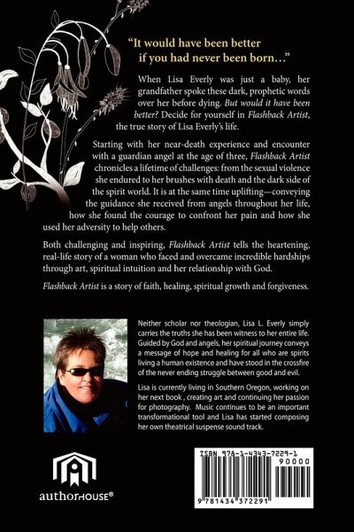 "It would have been better if you had never been born."When Lisa Everly was just a baby, her grandfather spoke these dark, prophetic words over her before dying. But would it have been better? Decide for yourself in Flashback Artist, the true story of Lisa Everly's life.Starting with her near-death experience and encounter with a guardian angel at the age of three, Flashback Artist chronicles a lifetime of challenges: from the sexual violence she endured to her brushes with death and the dark side of the spirit world. It is at the same time uplifting-conveying the guidance she received from angels throughout her life, how she found the courage to confront her pain and how she used her adversity to help others.Both challenging and inspiring, Flashback Artist tells the heartening, real-life story of a woman who faced and overcame incredible hardships through art, spiritual intuition and her relationship with God.Flashback Artist is a story of faith, healing, spiritual growth and forgiveness.________________________________________________Flashback Artist is written in story form as creative NonFiction based on the author's actual life and personal experiences. The names have been changed to preserve personal privacy.Additional information available at www.flashbackartist.com