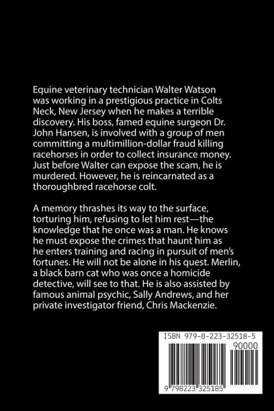 Equine veterinary technician Walter Watson was working in a prestigious practice in Colts Neck, New Jersey when he makes a terrible discovery. His boss, famed equine surgeon Dr. John Hansen, is involved with a group of men committing a multimillion-dollar fraud killing racehorses in order to collect insurance money. Just before Walter can expose the scam, he is murdered. However, he is reincarnated as a thoroughbred racehorse colt. A memory thrashes its way to the surface, torturing him, refusing to let him rest—the knowledge that he once was a man. He knows he must expose the crimes that haunt him as he enters training and racing in pursuit of men's fortunes. He will not be alone in his quest. Merlin, a black barn cat who was once a homicide detective, will see to that. He is also assisted by famous animal psychic, Sally Andrews, and her private investigator friend, Chris Mackenzie.
