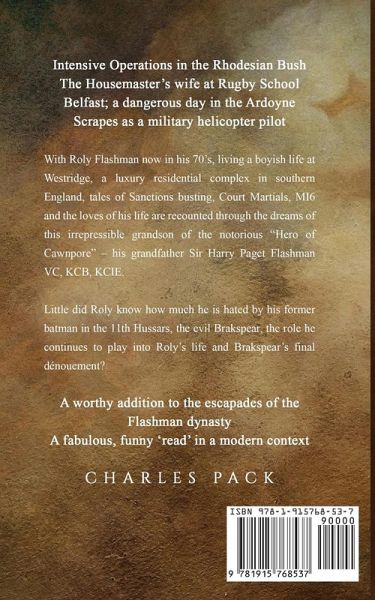 Roly Flashman, aged seventy, lives in his comfortable apartment at Westridge, a retirement complex in Southern England. He is a prodigious dreamer. Grandson of the infamous and notorious Harry Flashman, Roly's dreams recall his early school days at Rugby and in Switzerland, time with the 11th Hussars in Germany and an Infantry Battalion in Belfast, and life as a military helicopter pilot in various flashpoints around the world. "Flashman Rides Again" begins and ends with the tough circumstances faced by soldiers of the Rhodesian armed forces during UDI and the fight to retain their hands on the reins of governance against the inevitability of Mugabe rule. Exhaustive patrolling of the vast areas of the Zimbabwe bush provide a stark contrast to the intensity of Roly's successful ambush of the enemy within two weeks of his arrival there. Following a close shave with death, Roly then becomes involved in a sanctions-busting operation, so important for the nation's survival. Roly's dreams provide a very realistic picture of life as a soldier in Belfast during the Troubles, recalling intensive operations in the Ardoyne with his odious batman, Private Brakspear, by his side. Then, in danger of becoming a scapegoat for a senior officer's incompetence and, pending a Court Martial, Roly goes to work in the City where, unbeknownst to him, his aptitude for the British Secret Services is tested. With the threat of prosecution lifted, Roly is able to indulge a passion to enjoy life as a military helicopter pilot. All the while, his young-at-heart interaction with the other residents and the staff provide a contemporary and constant strand to the book including the re-emergence of the evil Brakspear. Little did Roly know how much he is hated by his former batman in the 11th Hussars, the evil Brakspear, the role he continues to play into Roly's life and Brakspear's final dénouement? An epilogue gives the reader an introduction to the next chapters of Roly's hectic world covering US Embassy hostages in Iran, bent politicians in Italy, a mad chase with the Mafia through San Francisco and political ambitions in the UK. Will Roly Flashman become an MP and achieve even higher office?!