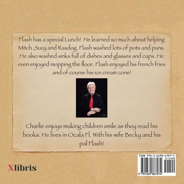 Flash has a special Lunch! He learned so much about helping Mitch ,Suzy and Rasdog. Flash washed lots of pots and pans. He also washed sinks full of dishes and glasses and cups. He even enjoyed mopping the floor. Flash enjoyed his French fries and of course his ice cream cone!