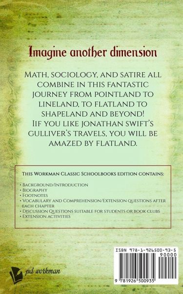 This Workman Classic Schoolbooks edition contains: * Background/Introduction * Biography * Footnotes * Vocabulary and Comprehension/Extension questions after each chapter * Discussion Questions suitable for students or book clubs * Extension activities Flatland was first published in 1884 and is a unique combination of satirical comment on Victorian society and mathematical exploration of geometry and the first through fourth dimensions. Though not as well-known as Jonathan Swift’s satire, Gulliver’s Travels, it has been commented on by Einstein, Isaac Asimov, Carl Sagan, and Stephen Hawking, and has even been mentioned in the television series The Big Bang Theory. A Square's journey through Pointland, Flatland, and Spaceland will give you a unique perspective on English society in the 1800s that stands on its own merit today.
