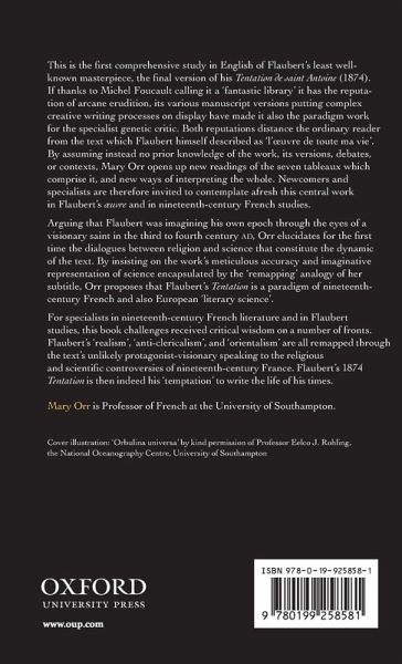 This is the first comprehensive study in English of Flaubert's least well-known masterpiece, the final version of his Temptation of Saint Anthony (1874) which, thanks to Foucault, has the reputation of being an arcane and erudite 'fantastic library' or, thanks to genetic criticism, is a 'narrative' of Flaubert's personal aesthetic ('oeuvre de toute ma vie'). By presuming instead no prior knowledge of the text, its versions or its contexts, Mary Orr provides new readings of the seven tableaux which comprise Temptation, and new ways of interpreting the work as a whole, whether the reader is a newcomer to Flaubert or a specialist. Arguing that Flaubert was imagining his own epoch through the eyes of a visionary saint in the fourth century AD, Orr elucidates the dialogues between religion and science that are the dynamic of the work for the first time. She also insists on the meticulous accuracy and imaginative representations of the science of the work, proposing - in the 'remapping' analogy of her subtitle - that Flaubert's Temptation is a paradigm of nineteenth-century French, and indeed European, 'literary science'. For nineteenth-century French and Flaubert specialists, this book then challenges received critical wisdom on a number of fronts. Through his unlikely protagonist-visionary, Flaubert's 'realism', 'anti-clericalism' and 'orientalism' are all given new airings in the religious and scientific evidence of the 1874 Temptation , as indeed in his 'temptation' to write the life of his times.