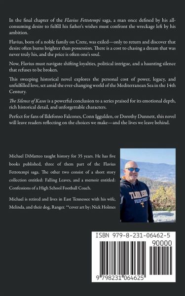 In the final chapter of the Flavius Fettotempi saga, a man once defined by his all-consuming desire to fulfill his father's wishes must confront the wreckage left by his ambition. Flavius, born of a noble family on Crete, was exiled-only to return and discover that desire often burns brighter than possession. There is a cost to chasing a dream that was never truly his, and the price is often one's soul. Now, Flavius must navigate shifting loyalties, political intrigue, and a haunting silence that refuses to be broken. This sweeping historical novel explores the personal cost of power, legacy, and unfulfilled love, set amid the ever-changing world of the Mediterranean Sea in the 14th Century. The Silence of Kasos is a powerful conclusion to a series praised for its emotional depth, rich historical detail, and unforgettable characters. Perfect for fans of Ildefonso Falcones, Conn Iggulden, or Dorothy Dunnett, this novel will leave readers reflecting on the choices we make-and the lives we leave behind.