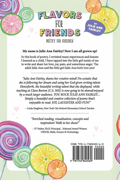 I was born and raised in The Bronx, New York, the borough that is known as "The Boogie Down Bronx." In Flavors For Friends, I revisited many experiences and lessons I learned as a child. I am the only daughter of Ms. Sadie Marie Applewhite. When I close my eyes, I can still hear her voice! "Julie Ann," she yelled as she stood in the front yard looking up and down the block for me. "Where in the world have you been?" Or, "Who is this you're bringing home now?" Or, "What did I tell you to do in the first place?" Or, "Didn't I tell you that everybody isn't your friend?" Or, "Where is your homework?" Or, "No...You can't go back outside." Or, "No...You can't have any company" and "No, You can't spend the night!" Or, "Don't ask me if she can stay for dinner because I can barely feed you." Or, "Girl, you better go somewhere and sit down!" From what I have observed and learned in the classroom, as much as things change, many of our life lessons are still necessary and remain the same. There is a common thread of situations and conflicts that children encounter. As a poet and writer, I felt the need to express myself and become the voice of love, joy, pain and sometimes angry for children of all ages. I have tapped into the little girl inside of me to write and share this book of poems. In her voice, I show children when an adult says, "I understand," there is truth in their words. The adult Julie Ann and the little girl, Julie Ann both love you!
