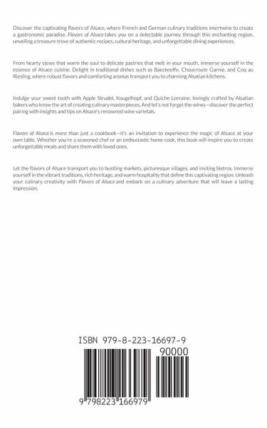 Embark on a gastronomic adventure through the enchanting region of Alsace, where French and German influences harmoniously blend to create a truly unique and unforgettable culinary experience. Flavors of Alsace invites you to explore the rich tapestry of tastes, traditions, and cultural heritage that define this captivating region. From hearty soups and stews that warm the soul to delicate pastries that delight the palate, this cookbook is a treasure trove of authentic recipes, passed down through generations and carefully curated to showcase the essence of Alsace cuisine. Discover classics like Baeckeoffe, Choucroute Garnie, and Coq au Riesling, where robust flavors and comforting aromas transport you to cozy Alsatian kitchens. Indulge in the delicate creations of Alsatian bakers with recipes for Apple Strudel, Kougelhopf, and Quiche Lorraine, each bite offering a symphony of flavors and textures. And don't forget to explore the world of Alsace wines, as this book offers insights and tips on pairing the perfect wine with your meals. With step-by-step instructions and helpful tips, Flavors of Alsace is more than just a cookbook; it's a journey of discovery, a celebration of heritage, and an invitation to create lasting memories with loved ones around the dining table. Whether you've experienced the charm of Alsace firsthand or are discovering it for the first time, this book will transport you to the bustling markets, the quaint villages, and the inviting bistros of this captivating region. Immerse yourself in the flavors, traditions, and spirit of Alsace as you embark on a culinary adventure that will leave a lasting impression. Indulge in the flavors of Alsace, and let this cookbook become your guide to unlocking the secrets of this vibrant and captivating culinary destination. Bon appétit!