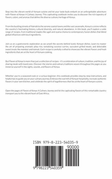 Embark on a tantalizing adventure through the vibrant and diverse flavors of Kenya in Flavors of Kenya: A Culinary Journey. Delve into the heart of East Africa's rich culinary heritage as you explore the traditional and contemporary dishes that define Kenyan cuisine. From the coastal region's tantalizing seafood dishes to the hearty stews and aromatic spices of the Maasai Mara, this cookbook takes you on a gastronomic tour of Kenya's diverse landscapes and cultural traditions. Discover the unique ingredients, techniques, and stories behind each recipe as you immerse yourself in the authentic tastes of this captivating country. Flavors of Kenya celebrates the culinary treasures that have been passed down through generations. Learn how to create iconic dishes like coconut curry prawns, swahili pilau, nyama choma, and mandazi. Dive into the world of indigenous ingredients, vibrant spices, and traditional cooking methods that make Kenyan cuisine truly special. Whether you're an experienced chef or a passionate home cook, this cookbook provides a gateway to the flavors and aromas of Kenya, inviting you to embrace its rich culinary tapestry. Discover the joy of communal dining and the warmth of Kenyan hospitality as you share these delicious meals with family and friends. Flavors of Kenya not only tantalizes your taste buds but also offers a glimpse into the cultural heritage that has shaped Kenyan cuisine. Whether you're seeking to expand your culinary repertoire or simply curious about the diverse flavors of East Africa, this book is your guide to a truly unforgettable gastronomic experience. Embark on a journey of flavor, tradition, and discovery with Flavors of Kenya: A Culinary Journey and savor the authentic tastes of this remarkable country.