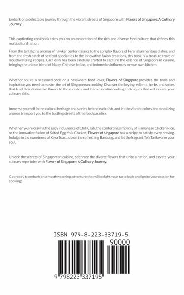 Flavors of Singapore: A Culinary Journey invites you to embark on a tantalizing exploration of Singapore's vibrant food culture. Step into the bustling hawker centers, savor the aromatic spices, and experience the harmonious fusion of Malay, Chinese, Indian, and Indonesian influences that make Singaporean cuisine so extraordinary. From beloved hawker center classics like Char Kway Teow and Hainanese Chicken Rice to the rich and intricate flavors of Peranakan heritage dishes such as Ayam Buah Keluak and Kueh Pie Tee, this cookbook brings the authentic taste of Singapore into your kitchen. Discover the secrets to perfecting seafood specialties like Chili Crab and Steamed Fish with Soy Sauce, and venture into the world of modern fusion with innovative recipes like Salted Egg Yolk Chicken and Laksa Pasta. With each recipe thoughtfully curated, Flavors of Singapore provides clear instructions, essential cooking techniques, and tips for stocking your pantry with key ingredients. Immerse yourself in the traditions that shape Singaporean cuisine, and bring the vibrant and tantalizing flavors of Singapore into your home. Whether you're a seasoned chef or a passionate home cook, this culinary journey will inspire you to explore the art of balancing flavors, experiment with new combinations, and celebrate the cultural heritage that enriches every bite. Join us as we unravel the tapestry of Singaporean gastronomy and create unforgettable dining experiences for family and friends. Indulge your senses, ignite your creativity, and embark on a flavorful adventure with Flavors of Singapore: A Culinary Journey. Get ready to awaken your taste buds and discover the diverse and delicious world of Singaporean cuisine!