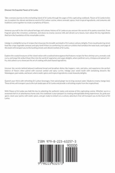 Embark on a captivating culinary adventure with Flavors of Sri Lanka, a delightful cookbook that unveils the vibrant and diverse world of Sri Lankan cuisine. From the enchanting land of spices and rich cultural heritage, this book takes you on a remarkable journey through aromatic flavors, tantalizing spices, and mouthwatering recipes. Immerse yourself in the captivating history and culture of Sri Lanka as you explore the unique ingredients that form the foundation of its cuisine. From aromatic cinnamon to exotic tropical fruits, coconut milk to fragrant curry leaves, discover the pantry essentials that bring the authentic flavors of Sri Lanka to life. Indulge your senses with a wide array of recipes that showcase the true essence of Sri Lankan culinary delights. From delectable appetizers and street food like crispy vegetable samosas and spicy lentil fritters, to the heartwarming rice and curry delights that are the epitome of Sri Lankan comfort food, each page of this book is a celebration of flavors. Delve into the abundant coastal treasures with the seafood extravaganza chapter, where you'll find tantalizing recipes for spicy shrimp curry, aromatic crab curry, and tangy fish ambul thiyal. Explore the vibrant world of vegetarian and vegan delights with mouthwatering recipes like jackfruit curry, chickpea and spinach stir-fry, and cashew curry that will satisfy any palate. Uncover the secrets behind beloved traditional bread and breakfast dishes in the hoppers, rotis, and pittu chapter. Indulge your sweet tooth with a delightful selection of Sri Lankan desserts in the Sweets and Desserts chapter. Learn to make popular treats like Watalappan, pani walalu, and kesari, and experience the fusion of exotic flavors that make Sri Lankan desserts truly irresistible. With Flavors of Sri Lanka, you'll not only discover a cookbook, but also a passport to the captivating world of Sri Lankan cuisine. Whether you're a seasoned chef or an adventurous home cook, this culinary guide will transport you to the enchanting flavors, aromas, and traditions of Sri Lanka, allowing you to create authentic and unforgettable dining experiences in your own kitchen. Get ready to embark on a mouthwatering journey through the tantalizing flavors of Sri Lanka.