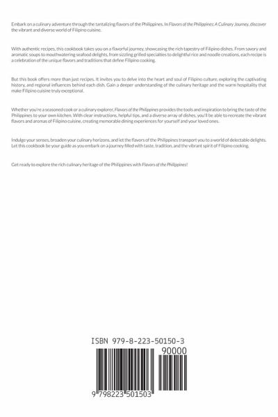 Embark on a tantalizing journey through the enchanting world of Filipino cuisine with Flavors of the Philippines: A Culinary Journey. This captivating cookbook invites you to immerse yourself in the rich tapestry of flavors, traditions, and vibrant dishes that make Filipino cooking truly special. Experience the heart and soul of Filipino cuisine as you explore authentic recipes, carefully curated to showcase the diverse culinary heritage of the Philippines. From savory and aromatic stews to mouthwatering seafood delicacies, from sizzling grilled specialties to delightful rice and noodle creations, each recipe is a celebration of flavors that will transport your taste buds to the bustling streets and lively kitchens of the Philippines. But this book goes beyond just recipes. It is a window into the captivating culture, history, and traditions that shape Filipino cuisine. Delve into the stories that bring each dish to life, and gain a deeper understanding of the culinary techniques, ingredients, and regional influences that make Filipino food so extraordinary. Whether you are an adventurous home cook eager to expand your culinary repertoire or a food enthusiast seeking a taste of the Philippines' vibrant flavors, Flavors of the Philippines is your ultimate companion. With detailed instructions, and helpful tips, this book will empower you to recreate the authentic flavors and aromas of Filipino dishes in your own kitchen. Get ready to tantalize your senses and embark on a culinary adventure like no other. Discover the warmth, passion, and vibrant flavors that define Filipino cuisine with Flavors of the Philippines. Let the magic of Filipino cooking inspire your culinary creativity and bring the taste of the Philippines to your table.