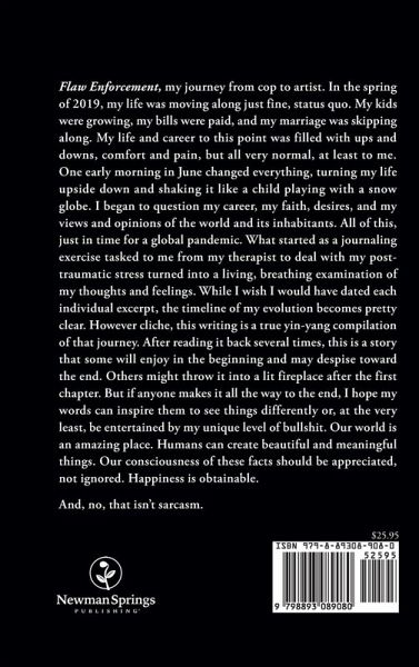 Flaw Enforcement, my journey from cop to artist. In the spring of 2019, my life was moving along just fine, status quo. My kids were growing, my bills were paid, and my marriage was skipping along. My life and career to this point was filled with ups and downs, comfort and pain, but all very normal, at least to me. One early morning in June changed everything, turning my life upside down and shaking it like a child playing with a snow globe. I began to question my career, my faith, desires, and my views and opinions of the world and its inhabitants. All of this, just in time for a global pandemic. What started as a journaling exercise tasked to me from my therapist to deal with my post-traumatic stress turned into a living, breathing examination of my thoughts and feelings. While I wish I would have dated each individual excerpt, the timeline of my evolution becomes pretty clear. However cliche, this writing is a true yin-yang compilation of that journey. After reading it back several times, this is a story that some will enjoy in the beginning and may despise toward the end. Others might throw it into a lit fireplace after the first chapter. But if anyone makes it all the way to the end, I hope my words can inspire them to see things differently or, at the very least, be entertained by my unique level of bullshit. Our world is an amazing place. Humans can create beautiful and meaningful things. Our consciousness of these facts should be appreciated, not ignored. Happiness is obtainable. And, no, that isn't sarcasm.