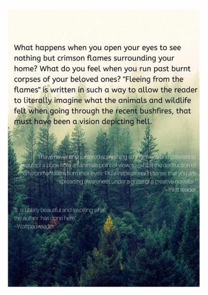 What happens when you open your eyes to see nothing but crimson flames surrounding your home? What do you feel when you run past burnt corpses of your beloved ones? "Fleeing from the flames" is written in such a way to allow the reader to literally imagine what the animals and wildlife felt when going through the recent bushfires, that must have been a vision depicting hell. A story that is written as a tribute to the lives lost in the Australian forest fire and a story to raise awareness of global warming and climate change.