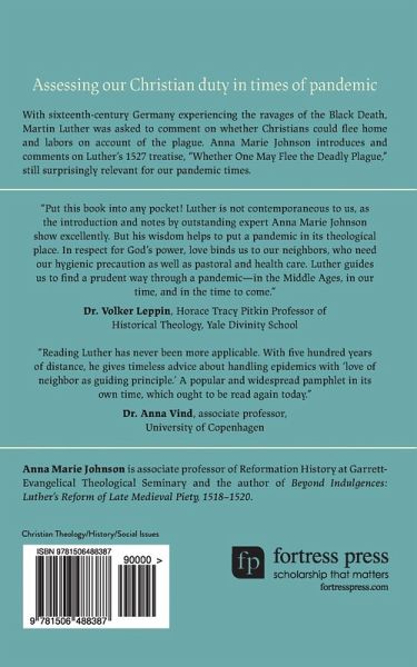 Bubonic Plague was an ongoing epidemic that sickened and killed many in Europe and beyond beginning in the mid-fourteenth century and continuing in the days of Martin Luther's sixteenth-century Germany. The pneumonic form of the disease was particularly dangerous because it entered the lungs and was spread by coughing. When this happened the fatality rate was nearly 100%. Martin Luther's treatise on whether one may flee when plague strikes was prompted by a request from the clergy of Breslau, who wondered whether a Christian could flee home and labors on account of the plague. Luther's pragmatic response focused on a Christian's responsibility to care for the sick and to use the means God gives to limit the plague's destruction. He lauded those who can face the plague without fear of death, but he emphasized that those with ""weak faith"" can flee in good conscience as long as they are not needed to care for someone or to maintain a public service. Luther used the occasion for the treatise to talk about the need for hospitals and public cemeteries outside the city center. Anna Marie Johnson introduces Luther's treatise and provides insightful annotations to help the reader understand Luther's text and his sixteenth century context. The parallels to the recent Covid pandemic and other epidemic diseases are striking. Though science and medicine have advanced greatly today, questions of ethical responsibilities are still with us, and Christians continue to wonder what faithful responses to pandemic should be.