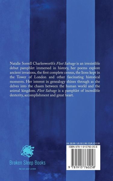 Natalie Sorrell Charlesworth's Fleet Salvage is an irresistible debut pamphlet immersed in history, her poems explore ancient invasions, the first complete census, the lions kept in the Tower of London and other fascinating historical moments. Her interest in genealogy shines through as she delves into the chasm between the human world and the animal kingdom. Fleet Salvage is a pamphlet of incredible dexterity, accomplishment and great heart.