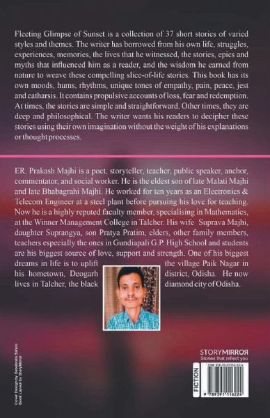 Fleeting Glimpse of Sunset is a collection of 37 short stories of varied styles and themes. The writer has borrowed from his own life, struggles, experiences, memories, the lives that he witnessed, the stories, epics and myths that influenced him as a reader, and the wisdom he earned from nature to weave these compelling slice-of-life stories. This book has its own moods, hums, rhythms, unique tones of empathy, pain, peace, jest and catharsis. It contains propulsive accounts of loss, fear and redemption. At times, the stories are simple and straightforward. Other times, they are deep and philosophical. The writer wants his readers to decipher these stories using their own imagination without the weight of his explanations or thought processes.