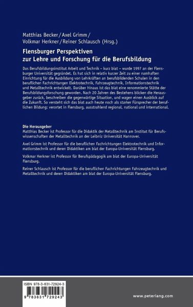 Das Berufsbildungsinstitut Arbeit und Technik - kurz biat - wurde 1997 an der Flensburger Universität gegründet. Es hat sich in relativ kurzer Zeit zu einer namhaften Einrichtung für die Ausbildung von Lehrkräften an berufsbildenden Schulen in den beruflichen Fachrichtungen Elektrotechnik, Fahrzeugtechnik, Informationstechnik und Metalltechnik entwickelt. Darüber hinaus ist das biat eine renommierte Stätte der Berufsbildungsforschung geworden. Nach 20 Jahren des Bestehens blicken die Herausgeber zurück, beschreiben die gegenwärtige Situation, und wagen einen Ausblick auf die Zukunft. So versteht sich das biat auch heute noch als starker Fürsprecher der beruflichen Bildung: verortet in Flensburg, ausstrahlend regional, national und international.