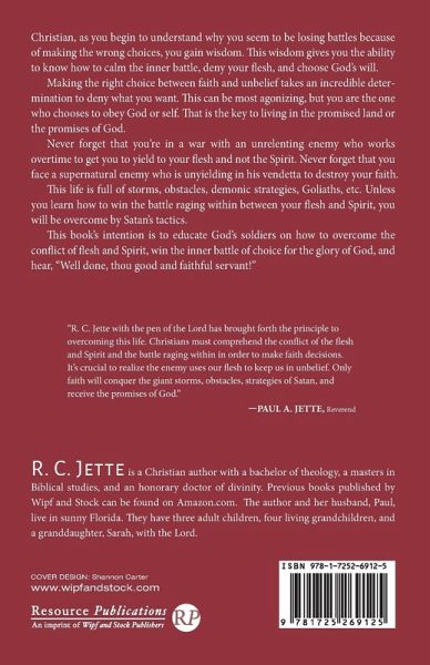 Christian, as you begin to understand why you seem to be losing battles because of making the wrong choices, you gain wisdom. This wisdom gives you the ability to know how to calm the inner battle, deny your flesh, and choose God's will. Making the right choice between faith and unbelief takes an incredible determination to deny what you want. This can be most agonizing, but you are the one who chooses to obey God or self. That is the key to living in the promised land or the promises of God. Never forget that you're in a war with an unrelenting enemy who works overtime to get you to yield to your flesh and not the Spirit. Never forget that you face a supernatural enemy who is unyielding in his vendetta to destroy your faith. This life is full of storms, obstacles, demonic strategies, Goliaths, etc. Unless you learn how to win the battle raging within between your flesh and Spirit, you will be overcome by Satan's tactics. This book's intention is to educate God's soldiers on how to overcome the conflict of flesh and Spirit, win the inner battle of choice for the glory of God, and hear, ""Well done, thou good and faithful servant!""