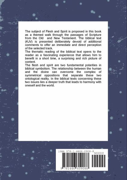 The subject of Flesh and Spirit, based on the research topics conducted by Fernand D'Amico and Jacques Wisman, is proposed in this book as a themed walk through the passages of Scripture from the Old and New Testament. The biblical text (KJV) is presented deliberately devoid of additional comments to offer an immediate and direct perception of the selected track. The thematic reading of the biblical text opens to the reader as a fascinating experience that allows him to benefit in a short time, a surprising and rich picture of content. The flesh and spirit are two fundamental polarities in biblical symbolism. The relationship between the human and the divine can overcome the complex of symmetrical oppositions that separate these two ontological reality. In the biblical texts concerning these two issues lies a deeper truth that leads to harmony with oneself and the world.