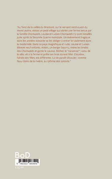 "Au fond de la vallée du Bramont, sur le versant nord-ouest du mont Lozère, existe un petit village qui abrite une ferme tenue par la famille Chomazels. Louise et Lucien Chomazels s'y sont installés juste après la Seconde Guerre mondiale. Un événement tragique dans les années soixante va les obliger à entrer brutalement dans la modernité. Dans ce pays magnifique et rude, Louise et Lucien élèvent neuf enfants. Anton, un berger bourru, mène les brebis des Chomazels et garde le causse. Michel, le "vacancier", venu de la ville, vit à la ferme et prête ses bras durant l'été. Claudine, l'aînée des filles, est différente. La vie paraît s'écouler, comme l'eau claire de la rivière, au rythme des saisons."