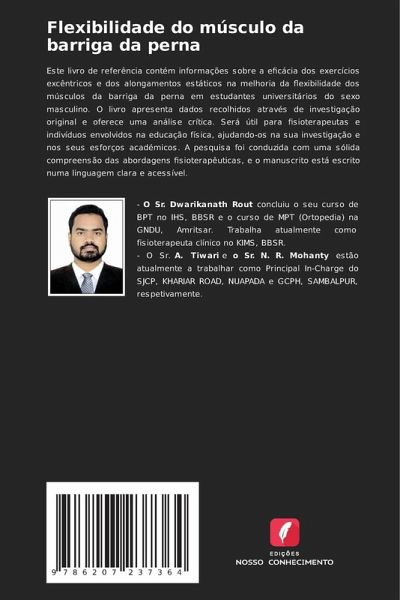 Este livro de referência contém informações sobre a eficácia dos exercícios excêntricos e dos alongamentos estáticos na melhoria da flexibilidade dos músculos da barriga da perna em estudantes universitários do sexo masculino. O livro apresenta dados recolhidos através de investigação original e oferece uma análise crítica. Será útil para fisioterapeutas e indivíduos envolvidos na educação física, ajudando-os na sua investigação e nos seus esforços académicos. A pesquisa foi conduzida com uma sólida compreensão das abordagens fisioterapêuticas, e o manuscrito está escrito numa linguagem clara e acessível.