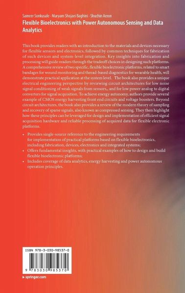 Chapter 1. Materials and Processing for Flexible Bioelectronics.- Chapter 2. Sensors and Platforms for Flexible Bioelectronics.- Chapter 3. Low-noise CMOS Signal Conditioning Circuits.- Chapter 4. Data Converters for Wearable Sensor Applications.- Chapter 5. Power Management Circuits for Energy Harvesting.- Chapter 6. Sampling and recovery of signals with spectral sparsity.- Chapter 7. Compressed Sensing.