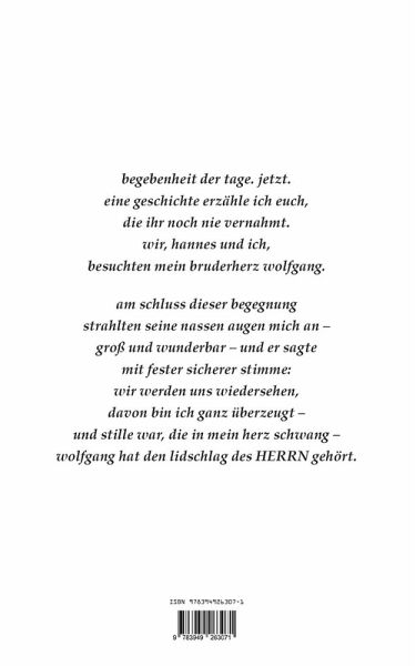begebenheit der tage. jetzt.eine geschichte erzähle ich euch, die ihr noch nie vernahmt. wir, hannes und ich, besuchten mein bruderherz wolfgang.am schluss dieser begegnung strahlten seine nassen augen mich an - groß und wunderbar - und er sagte mit fester sicherer stimme: wir werden uns wiedersehen, davon bin ich ganz überzeugt - und stille war, die in mein herz schwang - wolfgang hat den lidschlag des HERRN gehört.