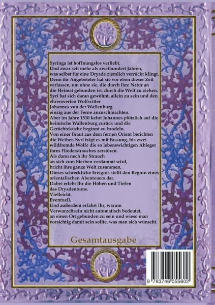 Syringa ist hoffnungslos verliebt. Und zwar seit mehr als zweihundert Jahren, was selbst für eine Dryade ziemlich verrückt klingt. Denn ihr Angebeteter hat sie vor eben dieser Zeit verlassen, um ohne sie, die durch ihre Natur an die Heimat gebunden ist, durch die Welt zu ziehen. Syri hat sich daran gewöhnt, allein zu sein und den ehrenwerten Wolfsritter Johannes von der Wallenburg einzig aus der Ferne anzuschmachten. Nur die alte Otter Schosch leistet ihr tagtäglich Gesellschaft, da diese sich zwischen den Wurzeln von Syringas heimischem Fliederstrauch angesiedelt hat. Aber im Jahre 1510 kehrt Johannes plötzlich auf die heimische Wallenburg zurück und die Gerüchteküche beginnt zu brodeln. Von einer Braut aus dem fernen Orient berichten die Weiber. Syri trägt es mit Fassung, bis zwei wildfremde Wölfe die so lebenswichtigen Ableger ihres Fliederstrauches zerstören. Als dann noch ihr Strauch an sich zum Sterben verdammt wird, bricht ihre ganze Welt zusammen. Dieses schreckliche Ereignis stellt den Beginn eines orientalischen Abenteuers dar. Dabei erlebt Ihr die Höhen und Tiefen des Dryadentums. Vielleicht. Eventuell. Und außerdem erfahrt Ihr, warum Verwurzeltsein nicht automatisch bedeutet, an einen Ort gebunden zu sein und wieso man vorsichtig damit sein sollte, was man sich wünscht.