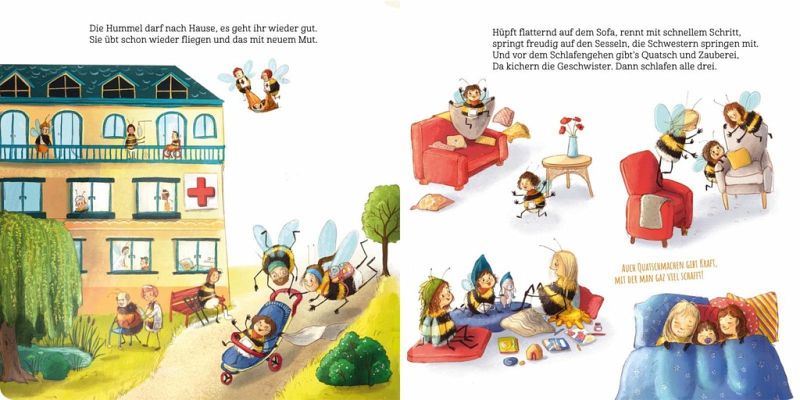 Dieses wunderschön illustrierte und gereimte Kinderbuch ist eine Hommage ans Leben. Die kleine Hummel möchte gerne fliegen. Doch das ist gar nicht so leicht mit einem dicken Pflaster und einem Schlauch am Bauch. Zum Glück hat das Hummelchen eine großartige Familie: Papa, Mama und seine beiden großen Geschwister. Mal ist das Hummelchen im Krankenhaus und dann wieder zu Hause. Dann klettert es im Wald auf Bäume, spielt Fangen und tanzt zu Musik, macht Quatsch und lacht, spaziert im Sand und Wasser am Meeresstrand. Seine Familie und Dr. Nektar setzen alles daran, dass Hummelchens großer Wunsch, fliegen zu können, Wirklichkeit wird.