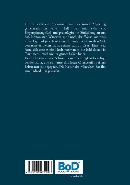 Hier arbeitet ein Kommissar mit der neuen Abteilung gemeinsam an einem Fall, der mit sehr viel Fingerspitzengefühl und psychologischer Einfühlung zu tun hat. Kommissar Wagemut geht nach der Weise vor, dass jeder Tag und jede Nacht eine Chance bietet, in dem Stil, den man aufbieten kann, seinen Fall zu lösen. Eine Frau hatte sich eine Arche Noah gezimmert, die bald darauf in Trümmern stand und ihr ganzes Leben hinzu. Der Fall beweist, wie Schwernis mit Leichtigkeit bewältigt werden kann, und es immer eine letzte Chance gibt, seinem Leben neu zu begegnen. Die Natur des Menschen hat ihn zum Individuum gemacht.