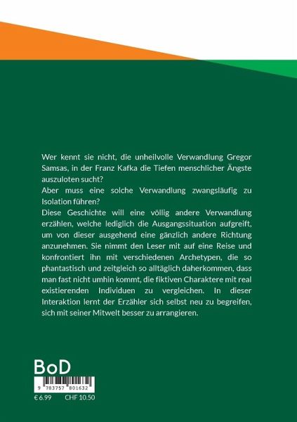 Wer kennt sie nicht, die unheilvolle Verwandlung Gregor Samsas, in der Franz Kafka die Tiefen menschlicher Ängste auszuloten sucht?Aber muss eine solche Verwandlung zwangsläufig zu Isolation führen?Diese Geschichte will eine völlig andere Verwandlung erzählen, welche lediglich die Ausgangssituation aufgreift, um von dieser ausgehend eine gänzlich andere Richtung anzunehmen. Sie nimmt den Leser mit auf eine Reise und konfrontiert ihn mit verschiedenen Archetypen, die so phantastisch und zeitgleich so alltäglich daherkommen, dass man fast nicht umhin kommt, die fiktiven Charaktere mit real existierenden Individuen zu vergleichen. In dieser Interaktion lernt der Erzähler sich selbst neu zu begreifen, sich mit seiner Mitwelt besser zu arrangieren.