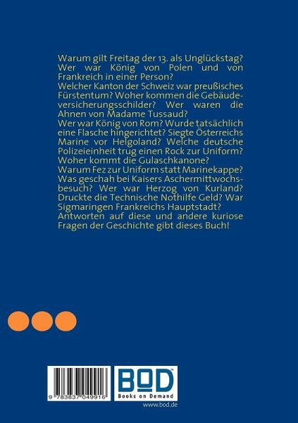 Warum gilt Freitag der 13. als Unglückstag ? Wer war König von Polen und von Frankreich in einer Person ? Welcher Kanton der Schweiz war preußisches Fürstentum? Woher kommen die Gebäudeversicherungsschilder? Wer waren die Ahnen von Madame Tussaud? Wer war König von Rom? Wurde tatsächlich eine Flasche hingerichtet? Siegte Österreichs Marine vor Helgoland? Welche deutsche Polizeieinheit trug einen Rock zur Uniform? Woher kommt die Gulaschkanone? Warum Fez zur Uniform statt Marinekappe? Was geschah bei Kaisers Aschermittwochsbesuch? Wer war Herzog von Kurland? Druckte die Technische Nothilfe Geld? War Sigmaringen Frankreichs Hauptstadt? Antworten auf diese und andere kuriose Fragen der Geschichte gibt dieses Buch!