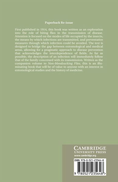 First published in 1914, this book was written as an exploration into the role of biting flies in the transmission of disease. Attention is focused on the modes of life occupied by the insects, the means by which infections are transmitted, and preventative measures through which infection could be avoided. The text is designed to bridge the gap between entomological and medical areas, allowing for a pragmatic approach to disease prevention that acknowledges the interdependence of fields. As far as possible, the description of an infection will immediately follow that of the family concerned with its transmission. Written as the companion volume to Non-bloodsucking Flies, this is an illuminating book that will be of value to anyone with an interest in entomological studies and the history of medicine.