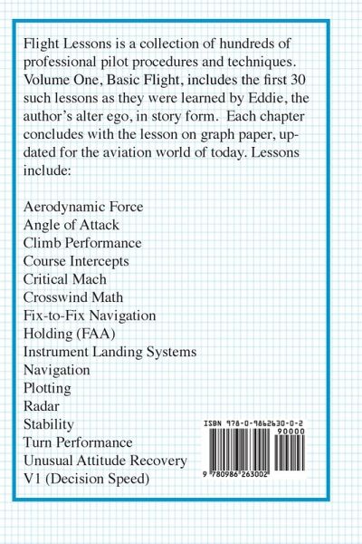 Flight Lessons is a collection of hundreds of professional pilot procedures and techniques. Volume One, Basic Flight, includes the first 30 such lessons as they were learned by Eddie, the author's alter ego, in story form. Each chapter concludes with the lesson on graph paper, updated for the aviation world of today. Lessons include: Aerodynamic force, air properties, angle of attack, the "Big Sky Theory," climb performance, the control and performance technique, course intercepts, critical mach, crosswinds, CR-3 and CPU-26 computers, fix-to-fix navigation, ground effect, holding (FAA), ILS, jet engine 101, mechanics, navigation, physics, plotting, radar, the region of reversed command, stability, thrust and drag, thrust measurement, turn performance, unusual attitude recovery, V-1 (decision speed), water injection, and wind shear.