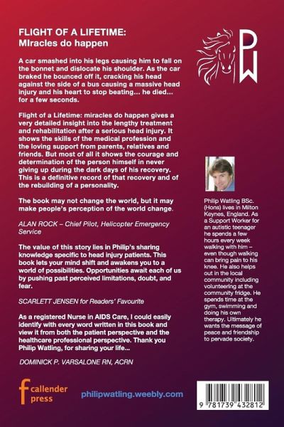 This new version has been completely redesigned and laid. New covers, new preface and historically brought up to date. Additionally, many added photos. Find out what Philip is up to now! After university Philip got his dream job: working with horses. All was going well for him until December 1994 when his life was to change forever. Crossing the road on the way to work, a car smashed into his legs causing him to fall on the bonnet and dislocate his shoulder. As the car braked he bounced off it, cracking his head against the side of a bus causing a massive head injury and his heart to stop beating... he died... for a few seconds. Fortunately death wasn't terminal and since being hit by that car and his subsequent unexpected recovery he has gone through a period of great change and has learned many things; having experiences he did not understand he also saw things mankind maybe should not see. He started writing these things down. What started as an autobiography about life, death and an unexpected resurrection has evolved into a truly inspirational book that will make the reader laugh and cry, often at the same time. Yet, in spite of its theme, it is not a miserable book - he wrote about his death and has even at times managed the not straightforward task of making the whole thing funny! Flight of a Lifetime: miracles do happen may not change the world, but it may make people's perception of the world change. Flight of a Lifetime: miracles do happen gives a very detailed insight into the lengthy treatment and rehabilitation after a serious head injury. It shows the skills of the medical profession and the loving support from parents, relatives and friends. But most of all it shows the courage and determination of the person himself in never giving up during the dark days of his recovery. This book is a definitive record of that recovery and of the rebuilding of a personality.