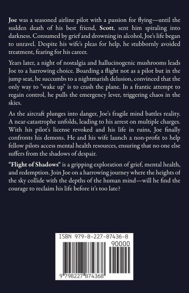 Joe was a seasoned airline pilot with a passion for flying-until the sudden death of his best friend, Scott, sent him spiraling into darkness. Consumed by grief and drowning in alcohol, Joe's life began to unravel. Despite his wife's pleas for help, he stubbornly avoided treatment, fearing for his career. Years later, a night of nostalgia and hallucinogenic mushrooms leads Joe to a harrowing choice. Boarding a flight not as a pilot but in the jump seat, he succumbs to a nightmarish delusion, convinced that the only way to "wake up" is to crash the plane. In a frantic attempt to regain control, he pulls the emergency lever, triggering chaos in the skies. As the aircraft plunges into danger, Joe's fragile mind battles reality. A near-catastrophe unfolds, leading to his arrest on multiple charges. With his pilot's license revoked and his life in ruins, Joe finally confronts his demons. He and his wife launch a non-profit to help fellow pilots access mental health resources, ensuring that no one else suffers from the shadows of despair. "Flight of Shadows" is a gripping exploration of grief, mental health, and redemption. Join Joe on a harrowing journey where the heights of the sky collide with the depths of the human mind-will he find the courage to reclaim his life before it's too late?