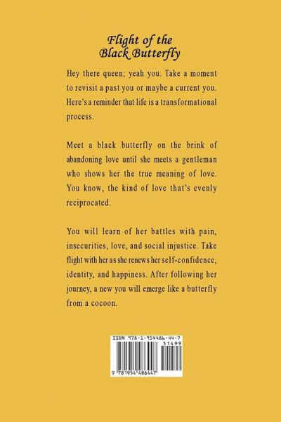Meet a black butterfly on the brink of abandoning love until she meets a gentleman who shows her the true meaning of love. You know, the kind of love that's evenly reciprocated. You will learn of her battles with pain, insecurities, love, and social injustice. Take flight with her as she renews her self-confidence, identity, and happiness. After following her journey, a new you will emerge like a butterfly from a cocoon.