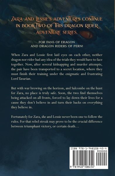 Zara and Lessie's adventures continue in book two of this dragon rider adventure series, for fans of Eragon and Dragonriders of Pern! When Zara and Lessie first laid eyes on each other, neither dragon nor rider had any idea of the trials they would have to face together. Now, after several kidnapping and murder attempts, the pair have been transported to a secret location, where they must finish their training under the enigmatic and frustrating Lord Tavarian. But with war brewing on the horizon, and Salcombe on the hunt for Zara, no place is truly safe. Soon, the two find themselves being attacked on all fronts, forced to lay down their lives for a cause they don't believe in and turn their backs on everything they believe in. Fortunately for Zara, she and Lessie never been one to follow the rules. For that rebel streak may prove to be the crucial difference between triumphant victory, or certain death....