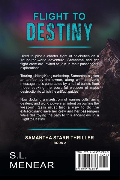 "Fasten your seat belt and hang on tight. This white-knuckle thrill ride flies you to places you never knew existed." Dallas Gorham, Verified Reviewer --Present Day-- Hired to pilot a charter flight of celebrities on a 'round-the-world adventure, Samantha and her flight crew are invited to join in their passengers' explorations. Touring a Hong Kong curio shop, Samantha is given an artifact by the owner, along with a cryptic message that's punctuated by a hail of bullets from those seeking the powerful weapon of mass destruction to which the artifact guides. Now dodging a maelstrom of warring cults, arms dealers, and world powers all intent on owning the weapon, Sam must find a way to do the extraordinary: save her crew and her passengers while destroying the path to this ancient evil in a Flight to Destiny. Publisher's Note: A retired airline pilot with U.S. Airways, S.L. Menear brings unparalleled realism and authenticity to this action-packed thriller. Written without vulgarity and explicit sexual content, this thrill-a-minute adventure can be enjoyed by readers of all ages and persuasions. This story was previously published as Poseidon's Sword and has been subsequently edited by the author. "The action scenes will leave you breathless as the confrontations play out over the course of the charter flight's route." Don Stratton, Verified Reviewer ". . . a fast-paced story filled with mystery, adventure, ancient prophesies, psychic phenomena, terrorists and, of course, romance." Richard Brumer, Verified Reviewer The Samantha Starr Thriller Series Flight to Redemption Flight to Destiny Triple Threat Stranded Vanished