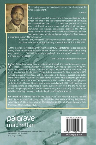 "Flight is well worth reading for anyone interested in the story of a true hero. Virgil Richardson's intriguing path through life should be must reading for anyone interested in The Tuskegee Airmen, a group of important figures in our history. This book also offers unique insight into the unknown stories of African Americans who settled in Mexico. Flight has detailed a underrepresented chapter in African American history and Mexican history." - Gregory Bell, author of In the Black: A History of African Americans on Wall Street