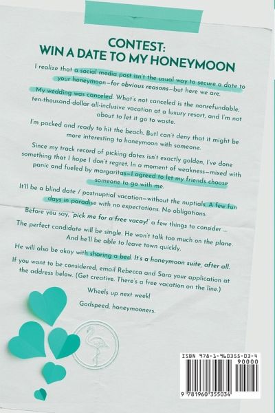 CONTEST: WIN A DATE TO MY HONEYMOON I realize that a social media post isn't the usual way to secure a date to your honeymoon-for obvious reasons-but here we are. My wedding was canceled. What's not canceled is the nonrefundable, ten-thousand-dollar all-inclusive vacation at a luxury resort, and I'm not about to let it go to waste. I'm packed and ready to hit the beach. ButI can't deny that it might be more interesting to honeymoon with someone. Since my track record of picking dates isn't exactly golden, I've done something that I hope I don't regret. In a moment of weakness-mixed with panic and fueled by margaritas-I agreed to let my friends choose someone to go with me. It'll be a blind date / postnuptial vacation-without the nuptials. A few fun days in paradise with no expectations. No obligations. Before you say, "pick me for a free vacay!" a few things to consider ... The perfect candidate will be single. He won't talk too much on the plane. And he'll be able to leave town quickly. He will also be okay with sharing a bed. It's a honeymoon suite, after all. If you want to be considered, email Rebecca and Sara your application at the address below. (Get creative. There's a free vacation on the line.) Wheels up next week! Godspeed, honeymooners. Grab your suitcase and prepare for the time of your life in this swoony tale that's as hot as the tropical destination itself. Fans of runaway brides, close-proximity, one-bed, and friends-to-lovers tropes will fall hopelessly in love with this fling-to-forever romance.