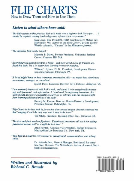 Introduction: Why This Book was Written. What It is and What It Isn't. Acknowledgements. Basics: Some Very Brief Comments on Theory. Problems With Using Flip Charts. Various Uses of Flip Charts. The Tools: The Easel. The Pad (Paper). The Marker. The Yard Stick. The Survival Kit. Making Corrections. Pocket Knife. Design and Technique: Printing. Color. Bullets. Balance and Symmetry. Non-Verbals. Reveals. Combinations. Notes. Mechanics: Orchestration. Reproducing Flip Charts. How to Find Your Charts. Transportation. Storage. Summary. A Partial List of Resources. Appendix A: Flip Chart Stand. Appendix B: Templates. About Richard C. Brandt. Index. Selected Illustrations.
