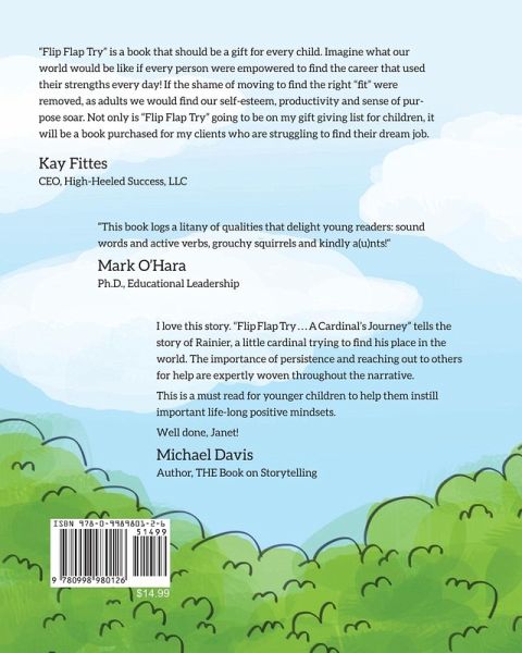 "Flip Flap Try . . . A Cardinal's Journey" tells the story of Rainier, a little cardinal trying to find his place in the world. The importance of persistence and reaching out to others for help are expertly woven throughout the narrative. Rainier doesn't settle on doing something because it's what he is supposed to do and if it doesn't make him happy. He continues searching until he finds his true passion. What food for thought not only for children but adults too.We are meant to be happy in life and spend time doing what makes us thrive and follow our dreams; not the norm. This book is a must read for younger children to help them instill important life-long positive mindsets and a reminder for adults it's never too late to change!.