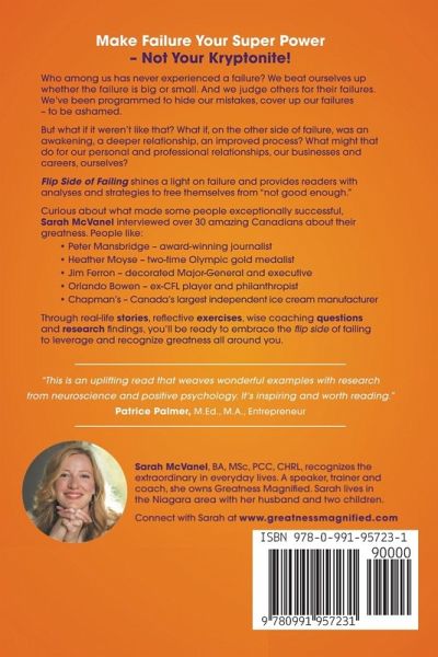 Who among us has never experienced a failure? We beat ourselves up whether the failure is big or small. And we judge others for their failures. We've been programmed to hide our mistakes, cover up our failures- to be ashamed. But what if it weren't like that? What if, on the other side of failure, was an awakening, a deeper relationship, an improved process? What might that do for our personal and professional relationships, our businesses and careers, ourselves? Flip Side of Failing shines a light on failure and provides readers with analyses and strategies to free themselves from "not good enough. Curious about what made some people exceptionally successful, Sarah McVanel interviewed over 30 amazing Canadians about their greatness. People like:¿¿Peter Mansbridge - award-winning journalist ¿¿Heather Moyse - two-time Olympic gold medalist ¿¿Jim Ferron - decorated Major-General and executive ¿¿Orlando Bowen - ex-CFL player and philanthropist ¿¿Chapman's - Canada's largest independent ice cream manufacturer Through real-life stories, reflective exercises, wise coaching questions and research findings, you'll be ready to embrace the flip side of failing to leverage and recognize greatness all around you.
