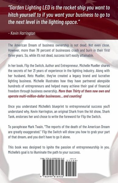 "Garden Lighting LED is the rocket ship you want to hitch yourself to if you want your business to go to the next level in the lighting space." – Kevin Harrington The American Dream of business ownership is not dead. Not even close. However, more than 78 percent of businesses crash and burn in their first three years. So, while it’s not dead, success isn’t easily attainable. In her book, Flip the Switch, Author and Entrepreneur, Michelle Mueller shares the secrets of her 21 years of experience in the lighting industry. Along with her husband, Reto Mueller, they’ve created a legacy brand and lucrative lighting business. Michelle illustrates how they have partnered alongside hundreds of entrepreneurs and helped many achieve their goal of financial freedom through business ownership. More than Thirty of them now own and operate multi-million-dollar businesses… and counting! Once you understand Michelle’s blueprint to entrepreneurial success you’ll understand why, Kevin Harrington, an original Shark from the hit show, Shark Tank, endorses her and chose to write the foreword for Flip the Switch. To paraphrase Mark Twain, "The reports of the death of the American Dream are greatly exaggerated." Flip the Switch will show you how to grab your part of that dream, and you don’t have to go it alone. This book was designed to ignite the passion of entrepreneurship in you. Michelle’s goal is to illuminate the path to your success.