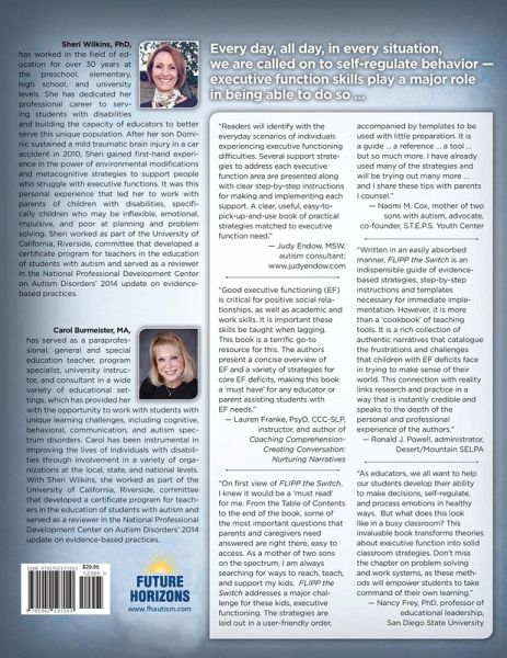 FLIPP the Switch: Strengthen Executive Function Skills is a practical book written for parents and educators by parents and educators. The target audience is anyone who works with young people aged 3-22 who are disorganized, inflexible, impulsive, and who struggle with planning or problem solving. Readers will learn about executive function (EF) and how EF skills contribute to success in school, at home, and in work environments. Most importantly, readers will receive specific instructions, templates, and how-to scenarios for 25 strategies, five strategies for each of the five FLIPP components – flexibility, leveled emotionality, impulse control, planning, and problem solving. This book is indispensable for anyone who wants to minimize conflict, maximize on-task behaviour, and support positive social-emotional development in a child or student with challenging behaviour. Although many educators associate deficits in EF skills with students on the autism spectrum, the reality is that many young people struggle with executive functioning. In fact, it is accurate to say that all young people are learning executive functioning as these skills are not fully developed until people are well into their twenties. In addition, several clinical conditions, such as attention deficit disorders, fetal alcohol syndrome disorder, intellectual disability, obsessive-compulsive disorders, social communication disorder, specific learning disability, Tourette’s Syndrome, and traumatic brain injury are often understood to have a component of EF deficits. Furthermore, individuals with diagnoses such as anxiety, depression, and schizophrenia may also exhibit deficits in the area of executive function. The good news is that there are evidence-based strategies that can be used at home, in school, in the community, and in work situations that can significantly improve the executive functioning of individuals who struggle in this area. Given the right tools, parents, educators, and others who work with this population can effectively structure the environment and teach strategic thinking skills that will support the critical life skills of flexibility, leveled emotionality, impulse control, planning, and problem solving.